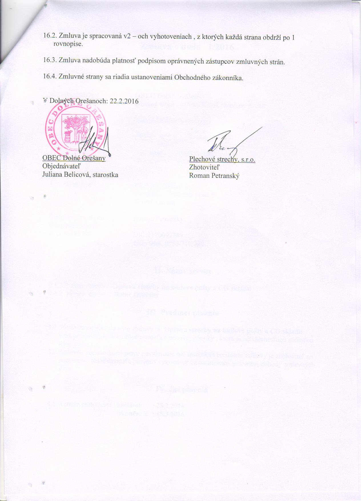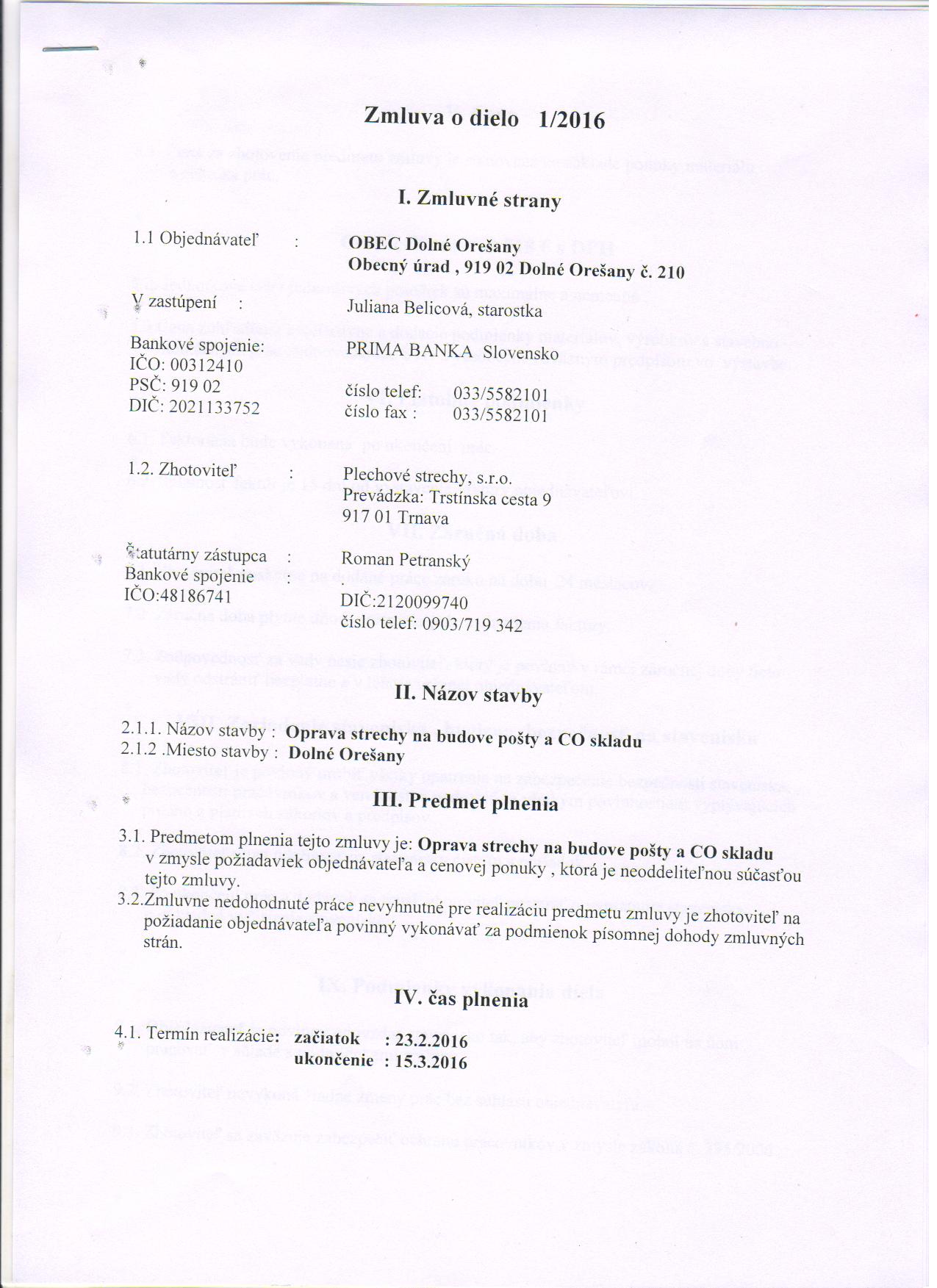 Detail zmluvy Zmluva o dielo 1/2016