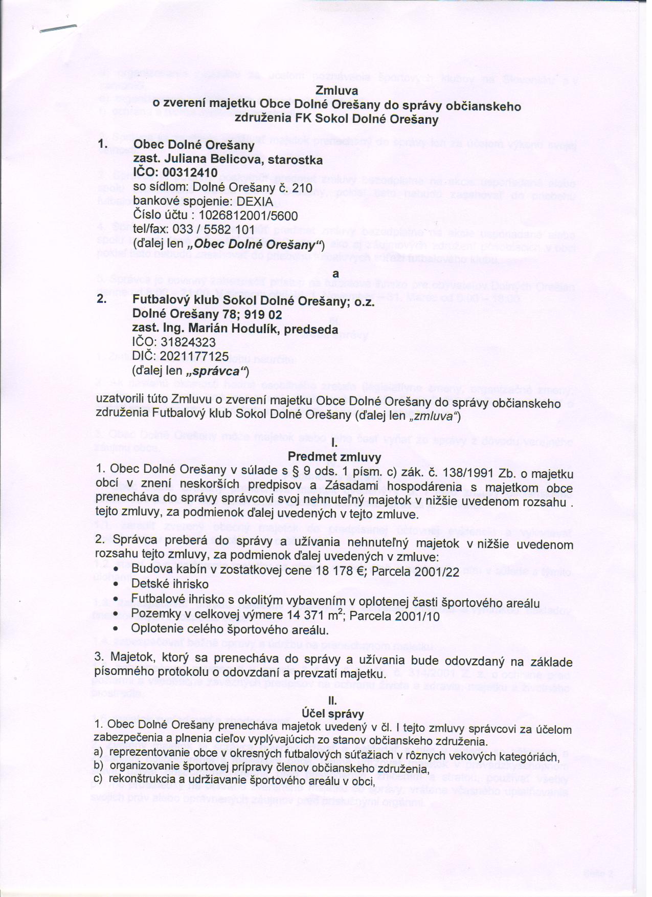 Zmluva o zverení majetku do správy FK Sokol
